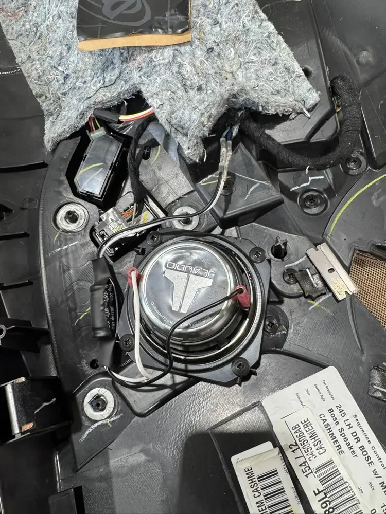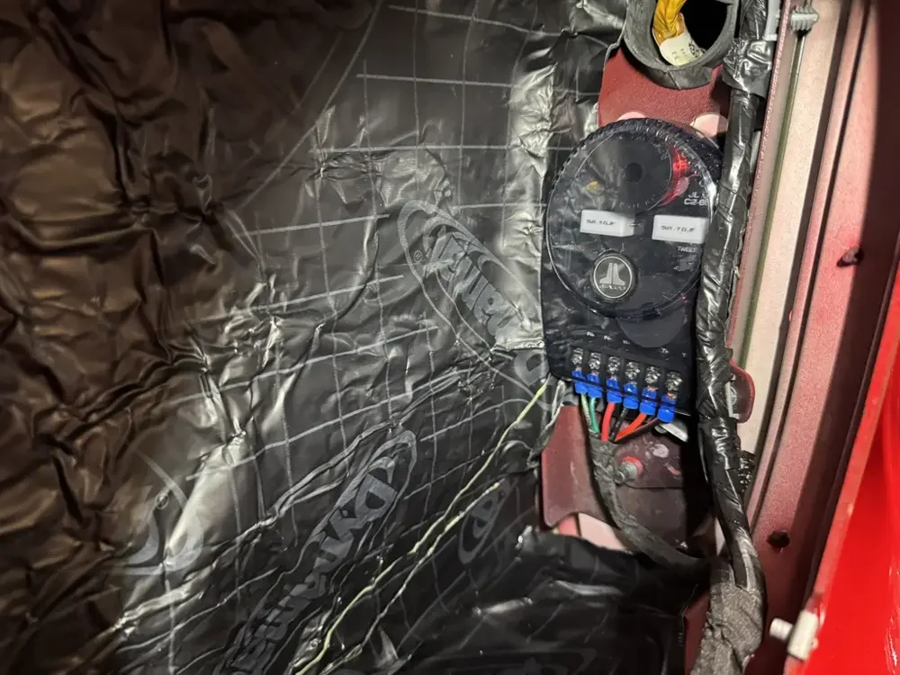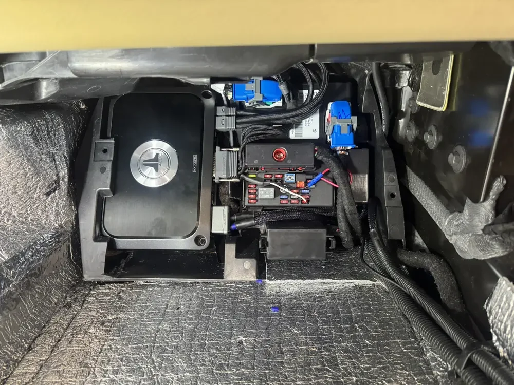 The cabin was stripped and rebuilt to cut noise/heat and improve ergonomics: comprehensive sound deadening and thermal insulation, upgraded seat tracks, and refreshed seat foam with new leather covers. The factory Bose system was replaced with a clean OEM-fit install—Kenwood CarPlay head unit, behind-seat JL subwoofers, custom-fitted JL door components (subs/mids/tweeters), all powered by a five-channel JL amplifier mounted in the original Bose amp location—for modern connectivity and balanced, high-fidelity sound.