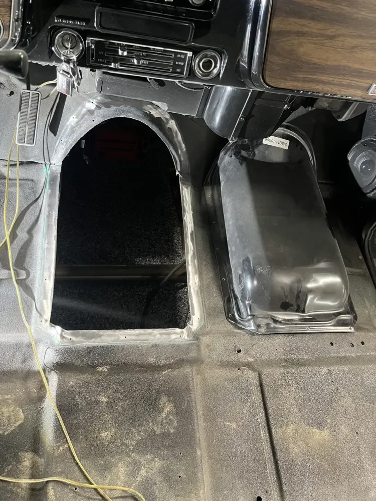To bring 1970s driving comfort up to modern standards, the cab received a Vintage Air HVAC upgrade, giving the truck electronically controlled heat and air conditioning for the first time. While the interior was apart, we added sound deadening and thermal insulation to cut heat soak and reduce noise. Both doors were removed for upgraded latches and fresh weatherstrips and glass channels..